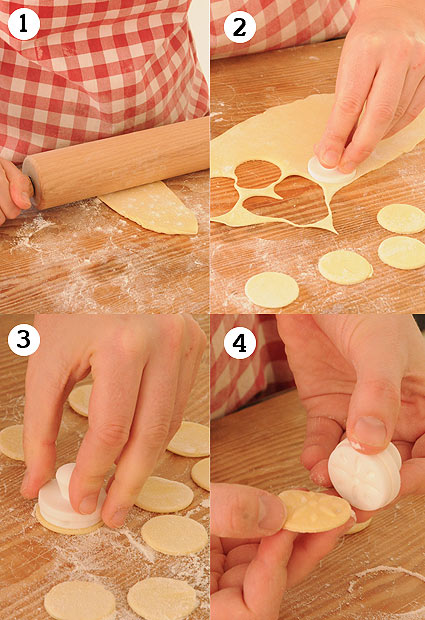 Ahora los métodos de preparación se separan: Si utilizas el sello de madera de Liguria, coloca el círculo de masa encima y presiona sobre él con la pieza opuesta, grabando el dibujo en la masa como si fuera una moneda. Puede que la masa se pegue un poco al sello, en cuyo caso basta con golpearla para despegarla. También puedes simplemente presionar la pieza estampada sobre la masa en la superficie de trabajo. Si quieres estampar ambos lados del croxetti, coloca el disco de masa sobre un sello y presiona el otro sobre él.